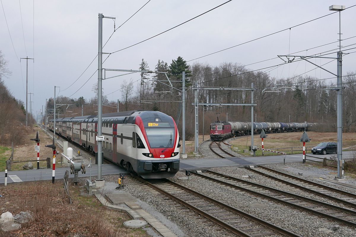 Und dann kamen sie gleichzeitig - RABe 511 027 als RE 4875 „RHEINTAL-EXPRESS“ von Wil nach Chur und Re 620 045-5 'COLOMBIER' mit Kesselwagen aus dem Tanklager Sennwald Richtung Buchs. Aufnahme entstand am 26.03.2018 in der Nähe des Bahnhofs Salez-Sennwald. Jürgen Vos