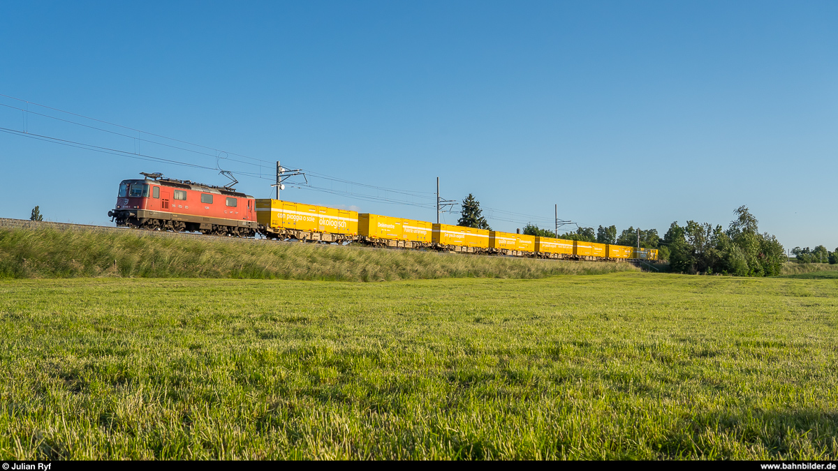 Für Überraschung beim Fotografen sorgte 185 589-9 von RheinCargo, die aus Richtung Rorschach kommend die Wagen durch den Bahnhof von Egnach Richtung Romanshorn zog. Am 30.04.2018 wurde hastig auf den Auslöser gedrückt. Jürgen Vos