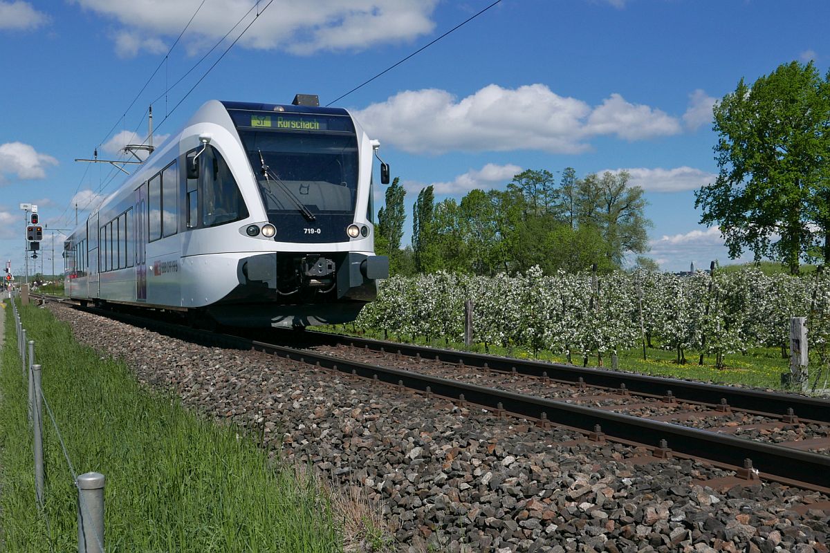 Kurz vor Egnach fährt RABe 526 745-5, am 30.04.2018 als S7 23740, Rorschach - Weinfelden, an einem ehemaligen Schrankenwärterhäuschen vorbei. Jürgen Vos