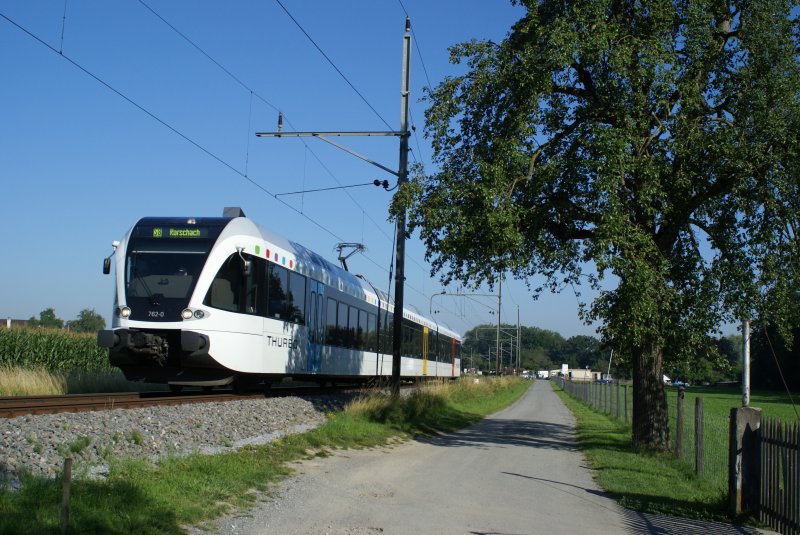 Der RABe 526 701 "Kanton Thurgau. fährt als S7 Rorschach-Weinfelden bei Buch dem See entlang. Er wird in Kürze Egnach erreichen. 6. Juli 2020 Marc Boltshauser