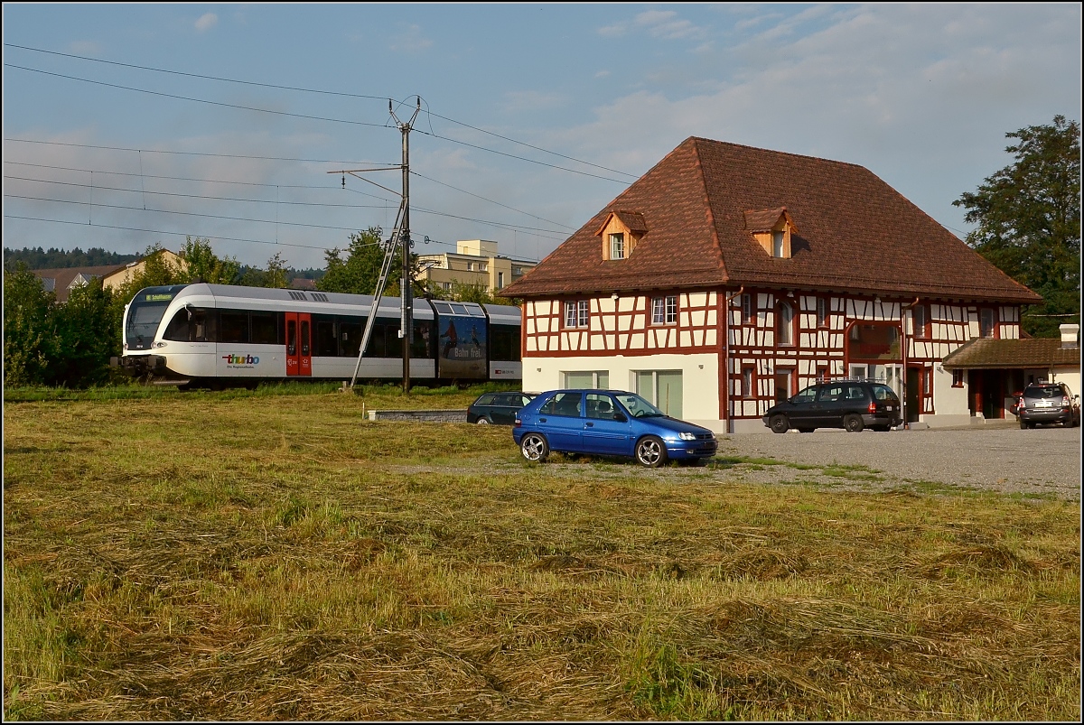 Farbige GTW der Thurbo (||) - Einfahrt von RABe 526 779-4 in den Bahnhof Tägerwilen-Gottlieben, der am 29.04.2017 unterwegs ist als S8 23874 von Schaffhausen nach St. Gallen. Jürgen Vos