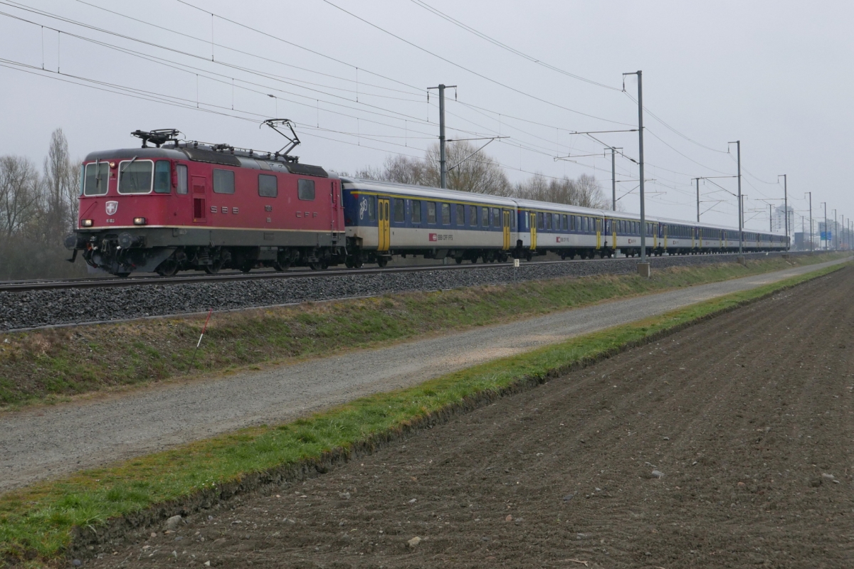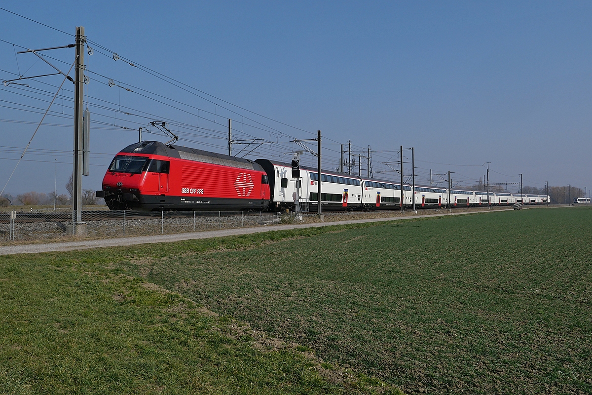 Und freundlich grüßt der Lokführer - Re 460 035-9 mit den Wagen des IR 2122, Konstanz - Luzern, kurz nach der Station Tägerwilen Dorf (04.03.2023) Jürgen Vos