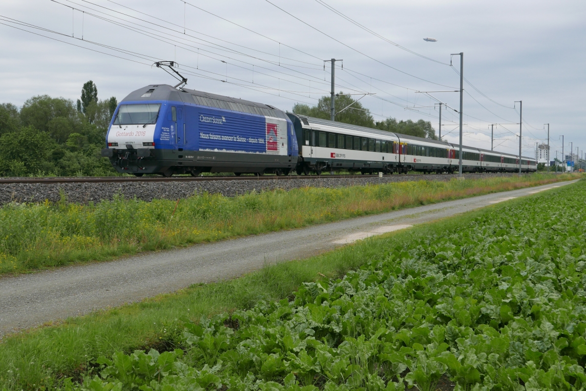 460 073-0 zieht die Wagen des IR 2118, Konstanz - Zürich, zwischen den Stationen Tägerwilen Dorf und Kreuzlingen Bernrain den Seerücken hinauf (11.06.2017). Jürgen Vos