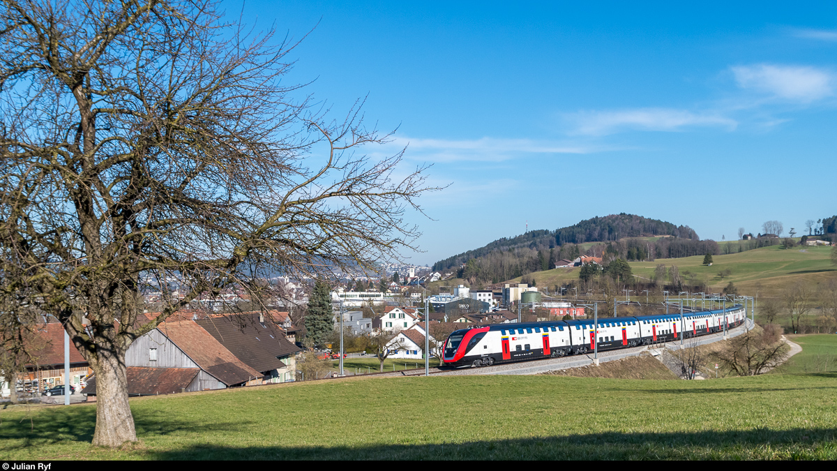 Der neue Twindexx RABe 502 206 ist am 27. Februar 2017 auf Testfahrt zwischen Sirnach und Eschlikon unterwegs. Bei dem Zug handelt es sich um eine IR200-Version, also die lange Version, aber ohne Restaurant und Speisewagen. Die Züge sollen neben Einsätzen auf IR-Linien auch zur Verstärkung der Ost-West-IC auf 400 m Zugslänge verwendet werden.
