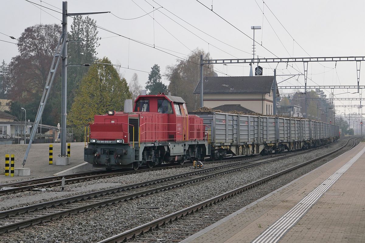 Von Frauenfeld kommend erreicht Am 841 013-6 mit der zweiten Wagengruppe am 10.11.2021 Bürglen (TG), damit die Wagen mit Zuckerrüben befüllt werden können. Aufnahmestandort am Ende des Bahnsteigs. Jürgen Vos