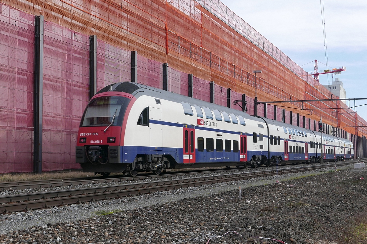 Der etwas andere Hintergrund für ein Bahnbild - Wenige Minuten vor seinem Ziel fährt RABe 514 038-9 als S30 8049, Winterthur - Weinfelden, in Märstetten an einer mit Schutznetzen abgesicherten Baustelle vorbei (30.01.2016).