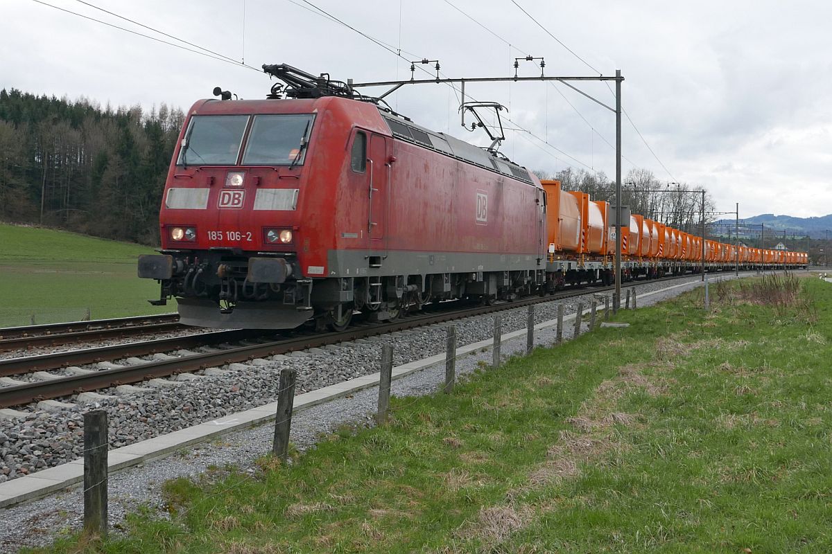 Der "Müllzug" auf der Rückfahrt von der Kehrrichtverbrennungsanlage Weinfelden. Am 29.03.2018 zieht 185 106-2 bei Sulgen die entleerten Behälter nach Kreuzlingen und Singen. Jürgen Vos