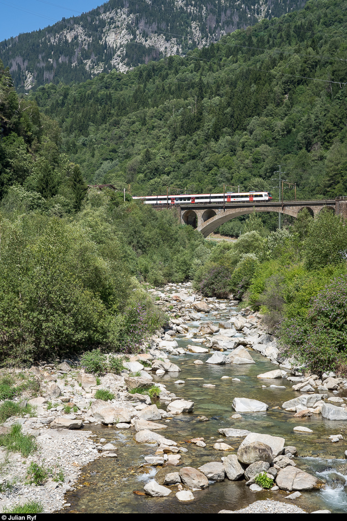 Aufgrund FLIRT-Mangel bei TILO verkehrt zurzeit ein Domino als RE am Gotthard. Am 4. August 2019 überquert er gerade die Polmengo-Brücke über den Ticino auf der Gotthard-Südrampe. Julian Ryf
