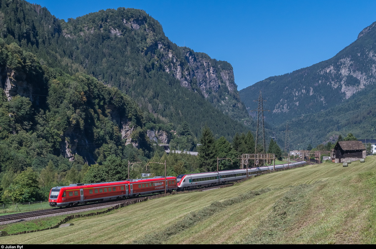 Der ICN RABDe 500 038 fährt am 23. August 2016 mit dem DB NeiTech-Messzug bei Faido die Gotthard-Südrampe hinauf. Der ICN dient dabei als fahrendes Zugsicherungsgerät, da der VT 612 über keine Schweizer Zugsicherung verfügt. Julian Ryf
