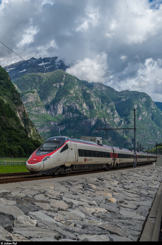 Ein ETR 610 befährt am 5. Juni 2016 als ICN die Rampe über das Südportal des Gotthard Basistunnels in Pollegio. Hinter dem Zug ist die Betriebzentrale Süd zu sehen, von wo der gesamte normalspurige Bahnverkehr der Schweiz südlich von Arth-Goldau gesteuert wird. Julian Ryf