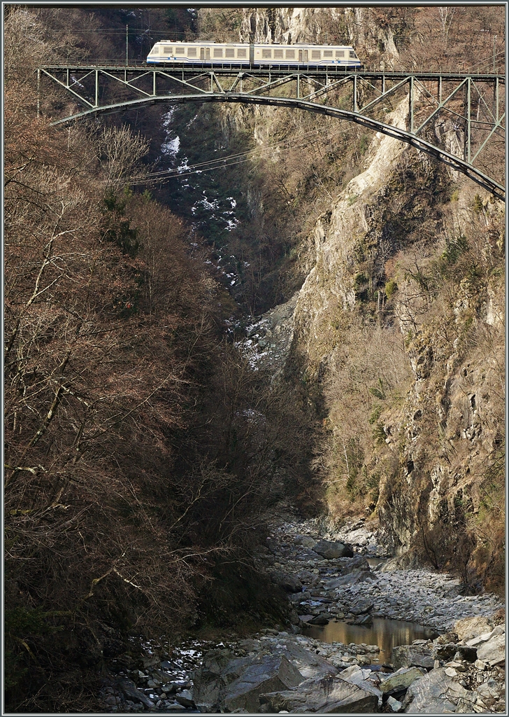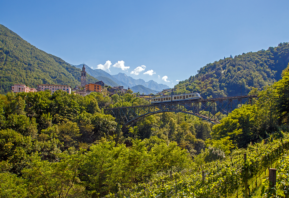 Die 132 Meter lange Isorno Brücke bei Intragna aus zwei verschiedenen Perspektiven: Auf diesem Bild vom tief eingeschnitten Tal aus; wobei die knapp nicht zu sehende Strassenbrücke kaum einen anderen Schnitt zulässt.
