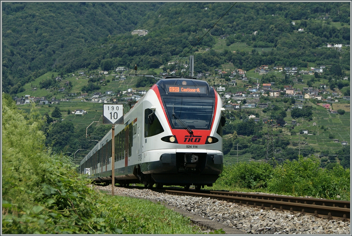 In Riazzino wurde der "Bahnhof" als Haltestelle gut einen Kilometer nach Westen verlegt; doch der ursprüngliche Bahnhof dient weiterhin als Kreuzungsstation der S20 TILO. das Bild entstand am Bahnsteigende der Haltestelle und zeigt neben dem ankommenden RABe 524 114 im Hintergrund die Lage des "alten Bahnhofes".