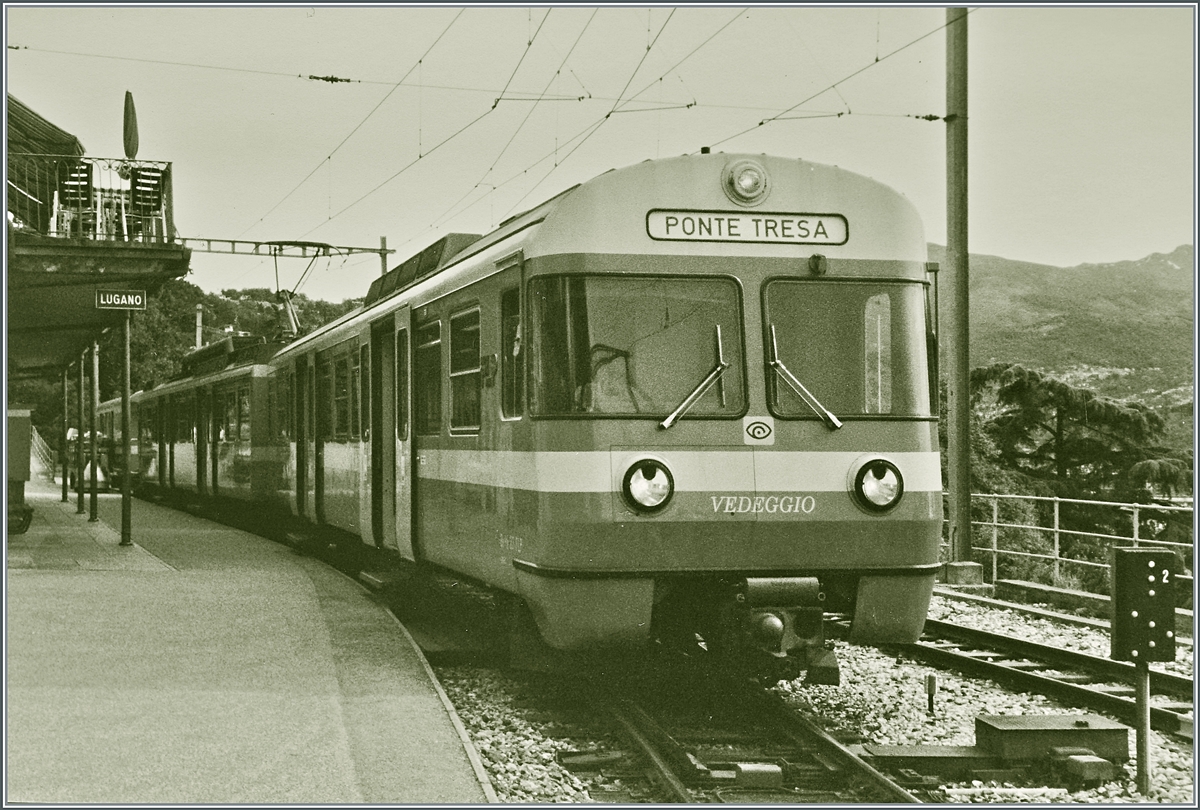 Der FLP Be 4/8 23 "Vedeggio" wartet in Lugano (FLP) auf die Abfahrt nach Ponte Tresa. Zwei Details: Die Zugzielanzeige schreibt "Ponte Tresa" vollständig aus, und rechts unten im Bild zeigt sich ein interessantes Weichensignal. ein Analogbild vom Sommer 1985