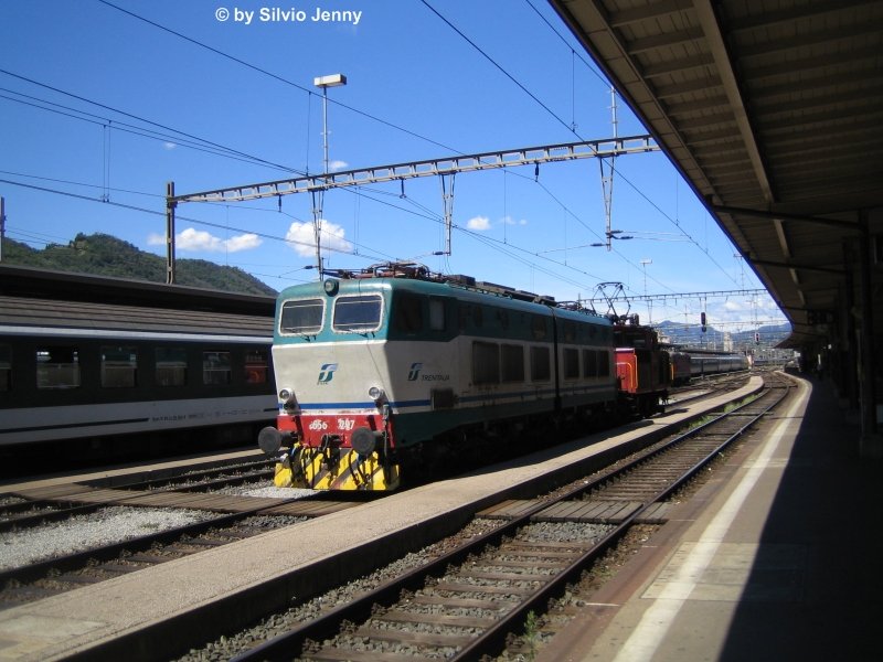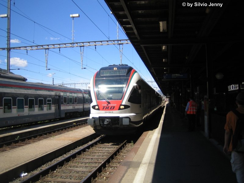 RBDe 560 106-7 ''Egnach'' steht am 3.8.07 in Chiasso für die Rückfahrt als S1 nach Biasca. Obwohl der Zug bereits mit ''Biasca'' angeschrieben, und der Triebwagen vorausfahren wird, ist am Fahrzeug immer noch die Schlussbeleuchtung eingeschalten Silvio Jenny