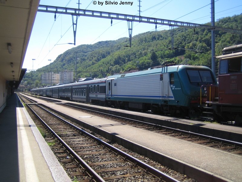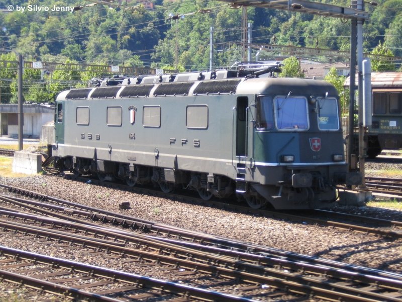 Re 6/6 11675 ''Gelterkinden'' ist seit neustem mit einer Führerstandsklimaanlage ausgerüstet, was man anhand des Anstrichs unweigerlich gut feststellen kann. Chiasso, 3.8.07 Silvio Jenny