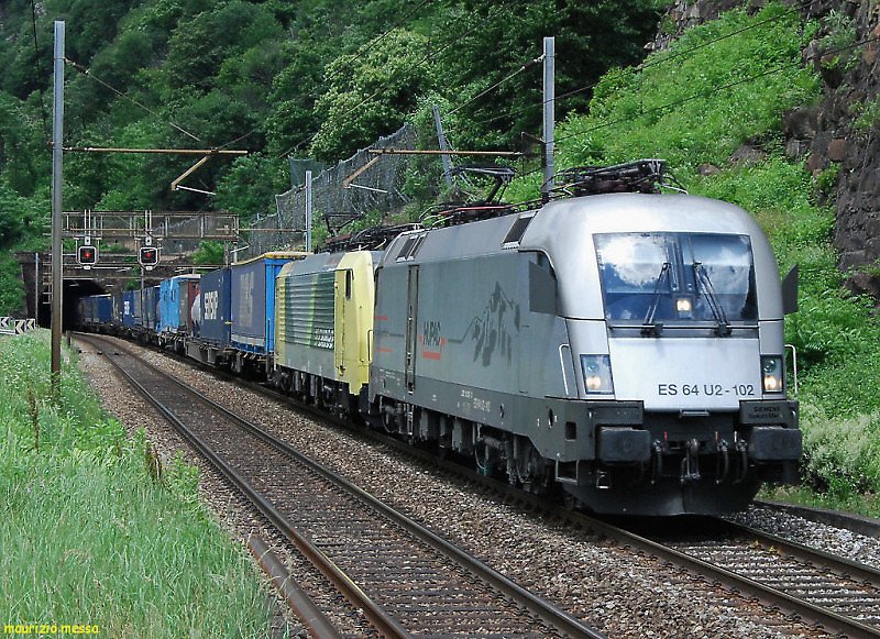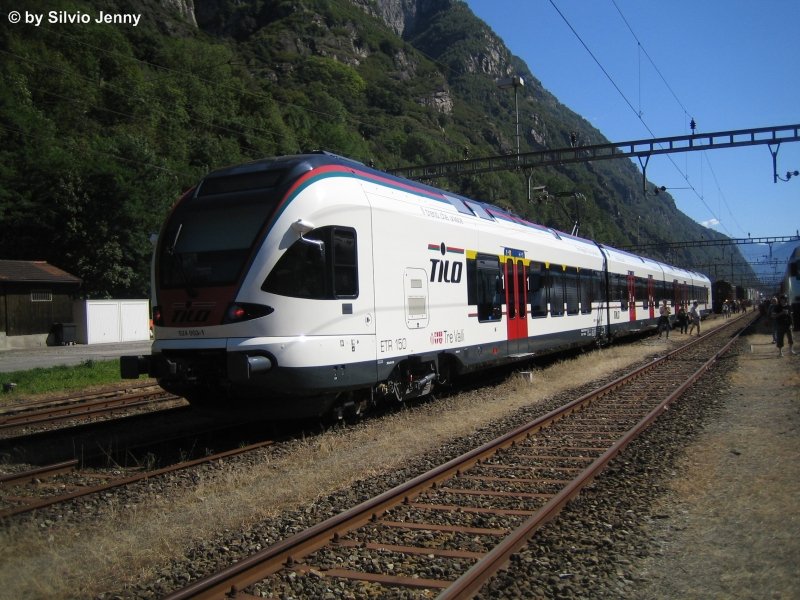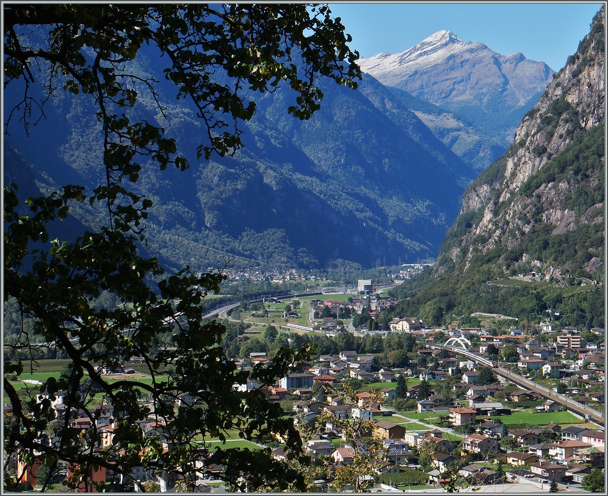 Erst auf den zweiten Blick ein Bahnbild und die beiden Züge, ein ICN und ein ETR 610 springen auch nicht gleich ins Auge. Doch das Bild zeigt alte (rechts) und neue (links) Linienführung von Biasca Richtung Gotthardbassistunnel bzw Gotthard Südrampe und im Hintergrund des Stellwerk von Pollegio.