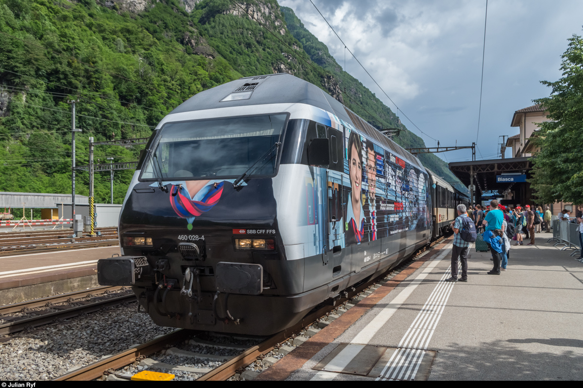 Re 460 028 erreicht am 5. Juni 2016 mit einem InterRegio nach Luzern - Basel SBB den Bahnhof Biasca. Die Lok trägt eine Werbebeklebung für das Zugpersonal der SBB. Julian Ryf
