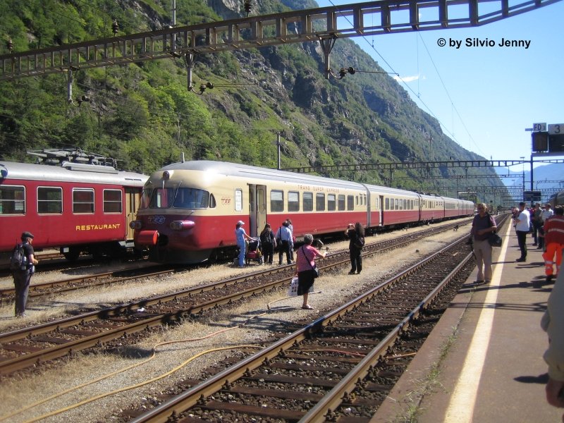 RAe TEE 1053 anlässlich des 125 Jährigen Gotthard Jubiläums in Biasca ausgestellt. Dieser TEE-Zug ist der grösste Stolz der SBB-Historic Flotte, zum einen wegen seinem einstigen Prestige Status, zum andrene, da er aus einem Trümmerhaufen wieder einsatzbereit gemacht werden konnte. Silvio Jenny