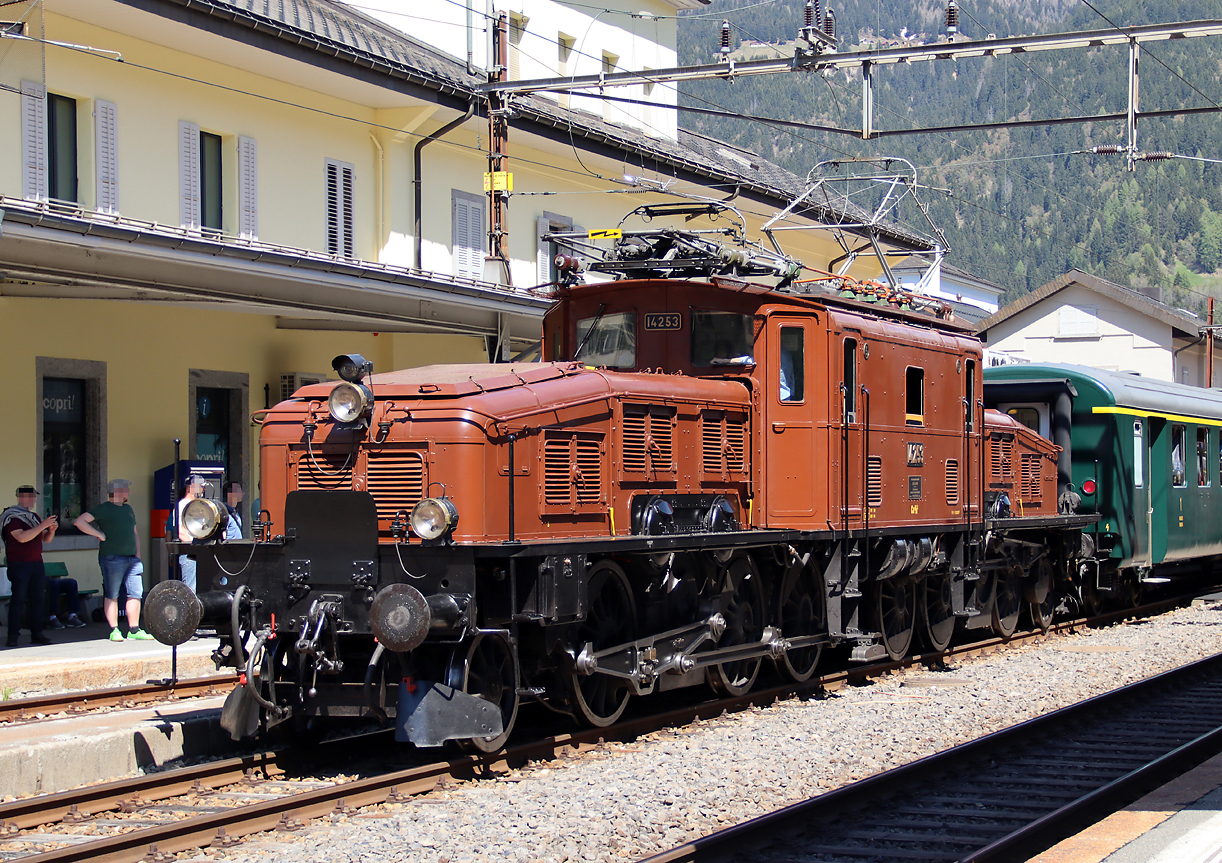 Das Krokodil Ce 6/8 II 14253 (91 85 4601 253-8) mit den Wagen A 229, WR 700, A 2301 (SR Club 611) und A 2302 (SR Club 610) vom Depot Erstfeld unterwegs als Erlebniszug San Gottardo. Geführt als Extrazug EXT 31055 von Erstfeld nach Lavorgo.