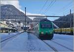 Nach Nebel und Schatten drei Winterbilder - so wie man sich den (Foto)-Winter vorstellt: In Airolo vermögen die Sonnenstrahlen am späteren Vormittag über die hohen Berge für knapp drei Stunden bis ins Tal zu scheinen und dabei den ausfahrenden SOB RABe 526 217 in ein herrliches Licht zu tauchen. Der Treno Gottardo ist als IR 46 2413 von Zürich nach Locarno unterwegs.
