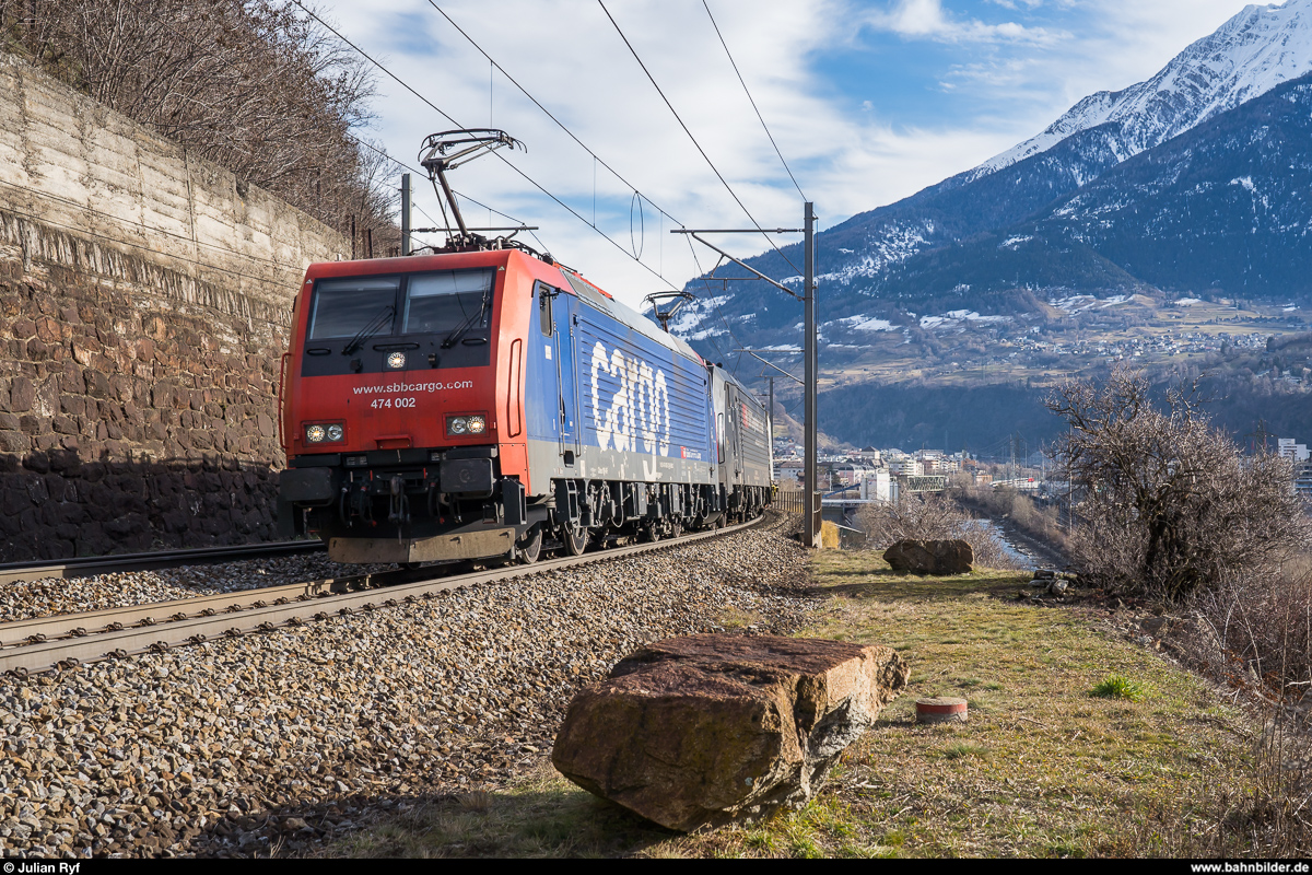 SBB Cargo Re 474 002 und eine MRCE-Schwesterlok mit einem UKV-Zug am 15. Februar 2020 kurz nach Brig. Julian Ryf