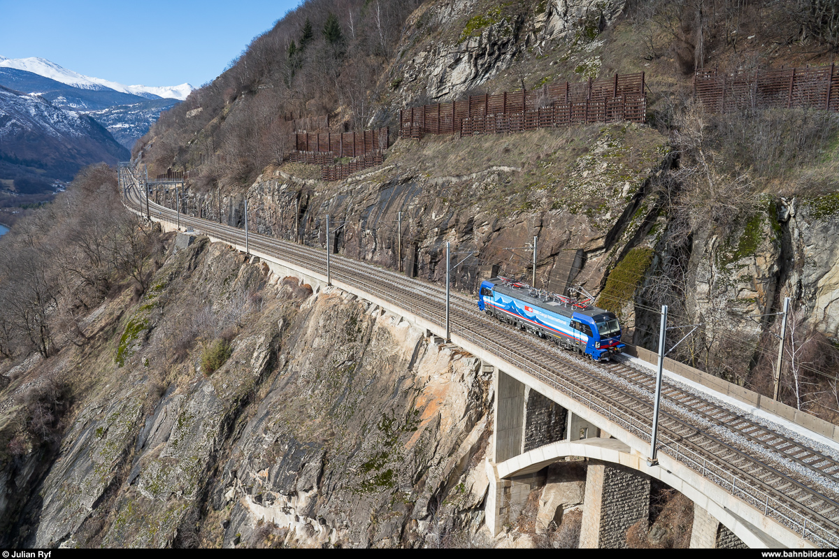 Die erst wenige Wochen alte 193 519 als Lokzug Goppenstein - Domodossola nach einem Einsatz als Schiebelok am 15. Februar 2020 an der Südrampe auf dem Mundbachviadukt. Julian Ryf