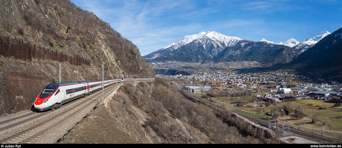 Trenitalia ETR 610 als EC 50 am 15. Februar 2020 auf der Rhonebrücke ausgangs Brig. Julian Ryf