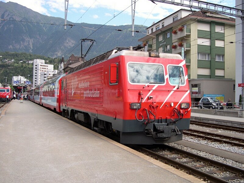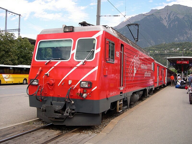 Berner Oberland 2007 - Über den Simplonpass aus Italien in Brig angekommen sind wir am 27.07.2007. MGB HGe 4/4 108 "Channel-Tunnel" hat sich vor den R 158 Brig - Disentis gesetzt, und in Kürze geht die Fahrt los. Jens Kaubisch