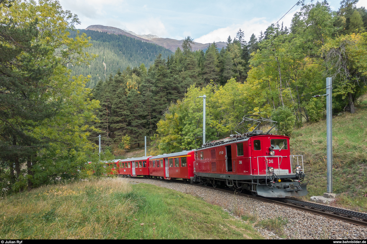 Pressefahrt des neugegründeten Vereins MGBahn-Historic (http://www.mgbahn-historic.ch/) am 29. September 2017. Die FO HGe 4/4 I 36 zog die Mitteleinstiegswagen der DFB von Brig nach Oberwald. In der Zahnstange oberhalb Fiesch. Julian Ryf