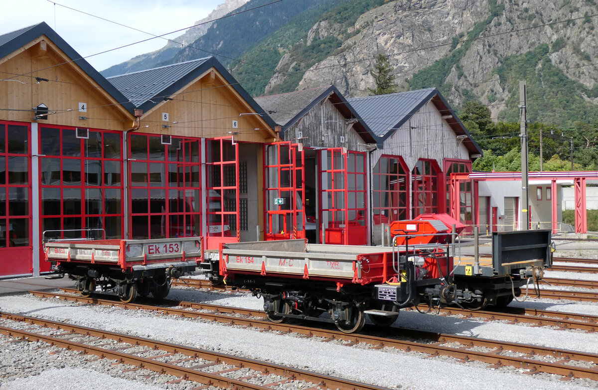 Leere Loorenwagen warten in Les Montuires (1821 müM) mit der blauen Lok auf ihren nächsten Einsatz auf der Strecke Richtung Lac d'Emosson. Les Montuires, 25.8.2025 Markus Gmür