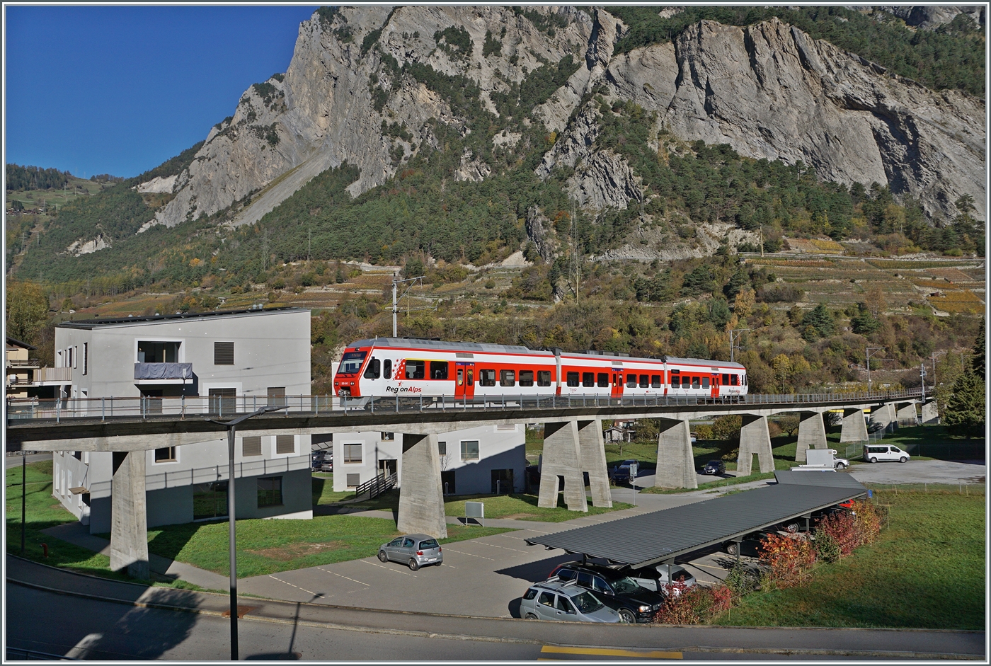 Der TMR / Region Alps NINA RABe 525 041 ist bei Sembrancher auf dem Weg von Le Châble nach Martigny und fährt über die 370 Meter lange Sembrancher Brücke. Die Stammstrecke der M-O führt nach Orsière, da beim Bau das Fernziel Aosta/Italien im Visier stand. Doch zum Bau der Mauvoisin Staumauer errichtete man die Zweistrecke nach Le Châble, die im August 1953 in Betrieb ging und heute danke dem Wintersportort Verbier weit mehr Verkehr aufweist, als der Streckenast nach Orsière.