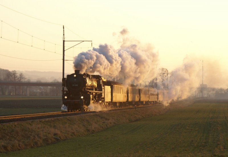 Die Pacific 01 202 ist mit einem Gedenkzug zum 136. Jahrestag der Aufnahme der Bourbaki-Armee in der Schweiz unterwegs. Im letzten Abendlicht des 3. Februar 2007 erwischte ich den Zug zwischen Avenches und Faoug auf der SBB-Strecke Payerne - Murten. Christian Barmettler
