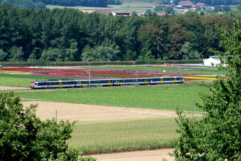 Die S21 12945, standesgemäss ein vierteiliger NPZ, ist am 31.8.2009 unterwegs im Broyetal und wird in Kürze die Haltestelle Trey ohne Halt durchfahren. Jonas Schaufelberger