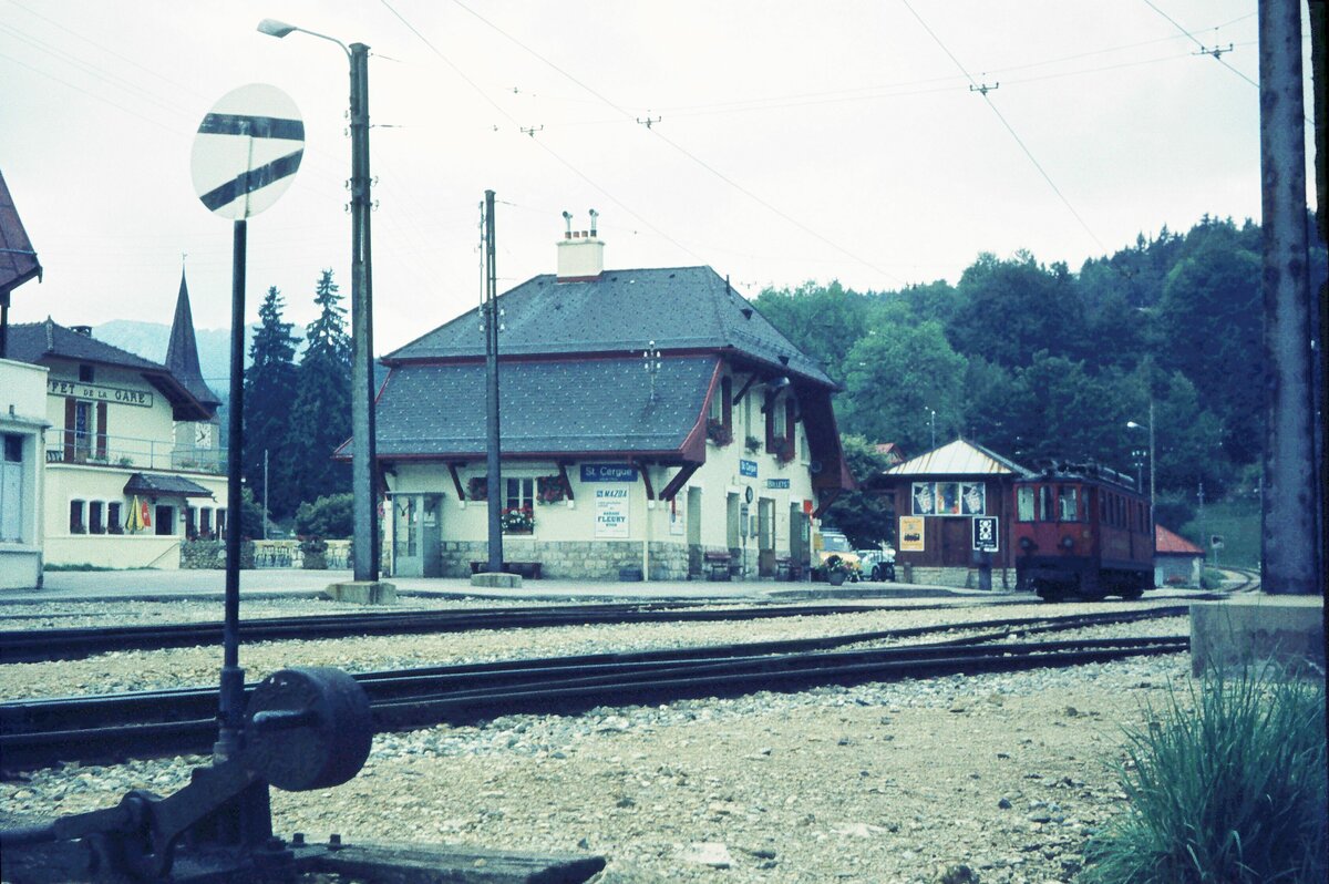 NStCM__Der Bahnhof von St.Cergue auf etwa 1/3 der Strecke nach La Cure, auf ca. 1050 m gelegen. Hier gibt es eine Fahrzeugremise.__09-1976 Klaus-Erich Lisk