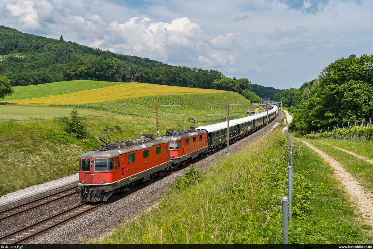 Am 12.06.2021 sind SBB Re 420 196-8 und Re 420 157-0 unterwegs mit den VSOE Wagen zwischen Cornaux nach Renens VD für Instruktionsfahrten und konnten hier bei Concise aufgenommen werden. Yannik Gartmann