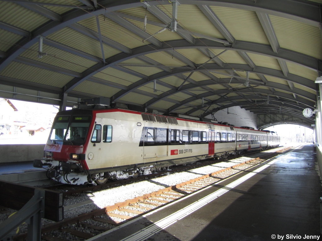 Architektonisch wunderbar, zum Fotografieren aber furchtbar... Die neue Bahnhofshalle des Bahnhofs Le Brassus mit dem RBDe 560 273-5 (ex RBDe 560 106-7 ''Egnach'') am 16.1.2013