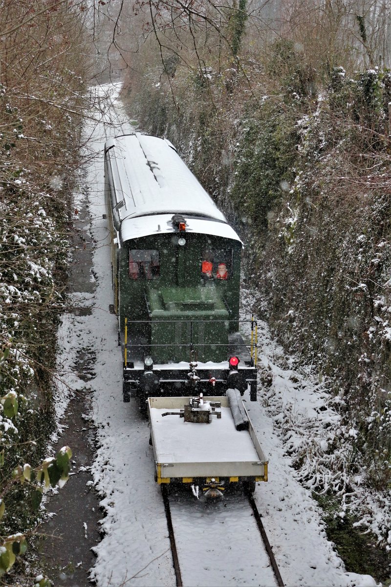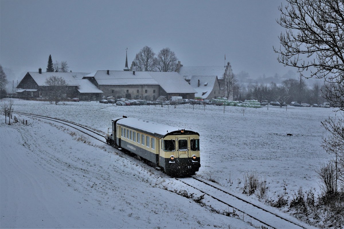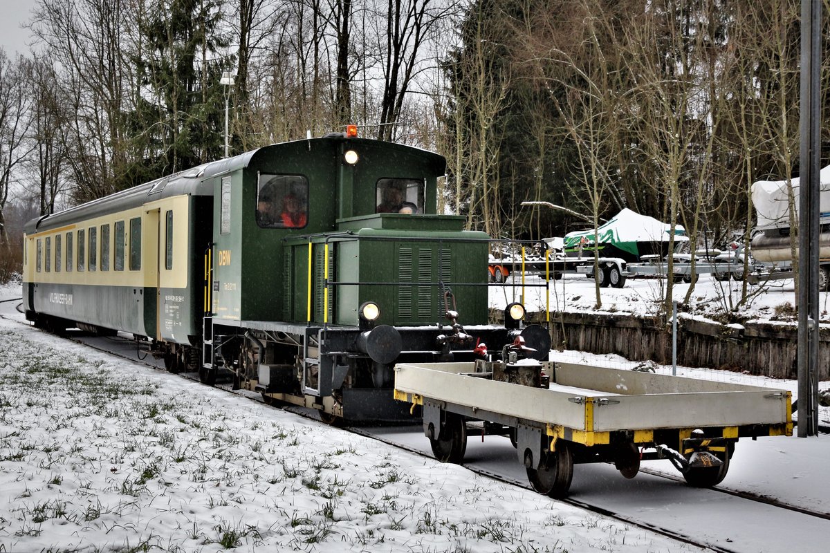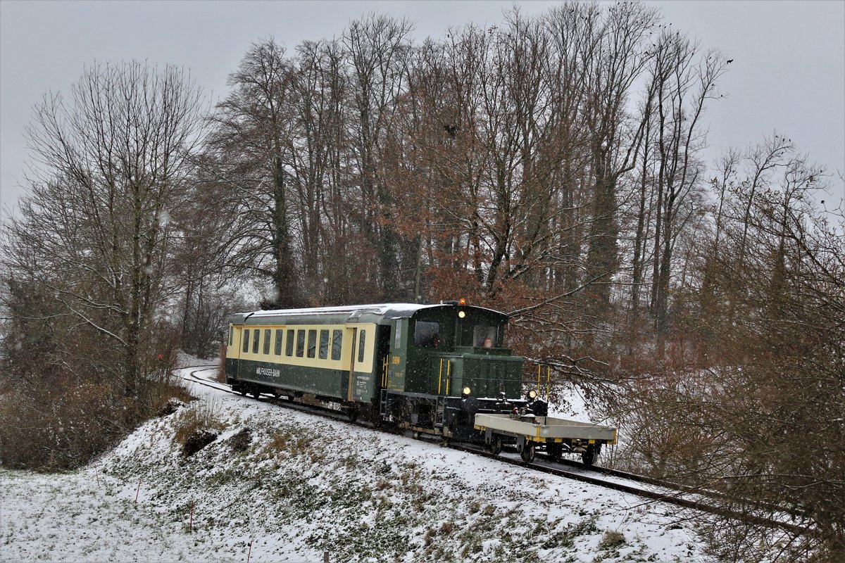 Zug "Wolfhuuser-Bahn": ABt 50 48 39-35 154-2 ex SOB und DSF Tm 2/2 II Nr. 111 ex AVO mit einem kleinem Gepäckwaggon am Zugschluss, anlässlich der Zubringerfahrten an den Weihnachtsmarkt im Ritterhaus Bubikon, zwischen Bubikon und Wolfhausen. Die Strecke war Teil des Schienennetzes der ehemaligen Uerikon-Bauma-Bahn, die heute nur für Draisinenfahrten oder sonst für Extrafahrten, eingesetzt werden. Sonntag, 10. Dezember 2017 Nicolas K.
