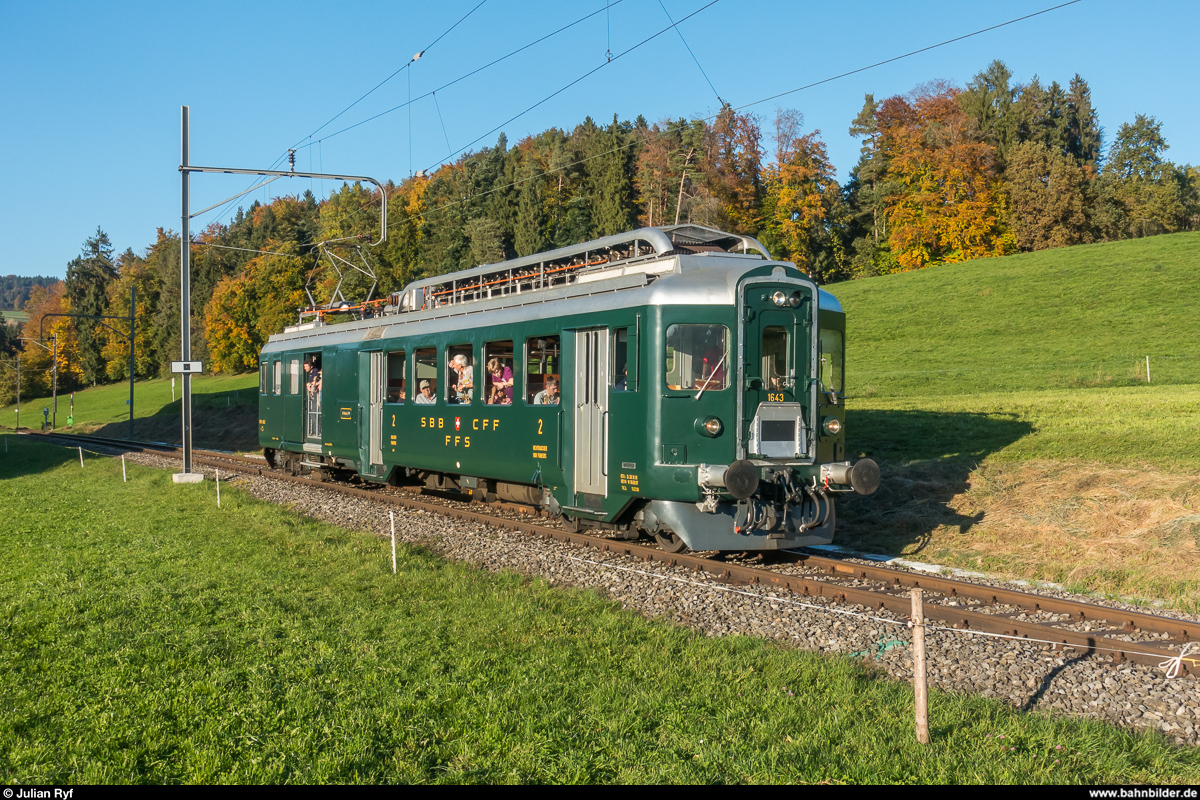 DVZO Fahrzeugtreffen 2017. BDe 4/4 1643 "Wyländerli" vom SBB Historic Team Winterthur am 15. Oktober 2017 auf dem Weg von Bauma nach Winterthur kurz nach Ettenhausen-Emmetschloo. Julian Ryf