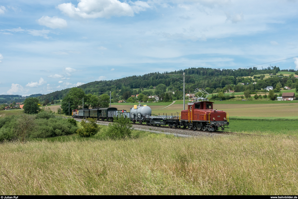 Überfuhr DVZO Ee 3/3 16363 mit GmP nach Besuch des Bahnparkfestes in Brugg am 28. Mai 2018 von Brugg nach Bauma. Die Be 4/4 15 leistete der Ee 3/3 ab Hinwil Vorspann. Bei Ettenhausen-Emmetschloo. Julian Ryf