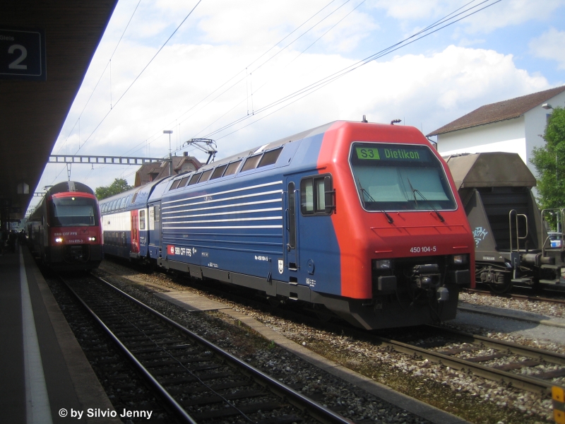 Re 450 104-5 "Zürich Hard" neben dem RABe 514 055-3 am 16.6.09 in Wetzikon. Für den DPZ der S3 ist hier Endstation, während der DTZ nich eine Station weiter nach Hinwil fährt. Silvio Jenny