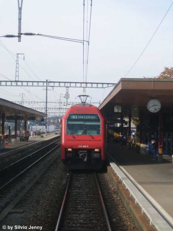 Schnappschuss aus der offenen Plattform des DVZO-Buffetwagens am 12.10.08 in Wetzikon, herhalten musste die Re 450 098-9 ''Grüningen'' die soeben Wetzikon mit einer S3 erreicht hat. Silvio Jenny