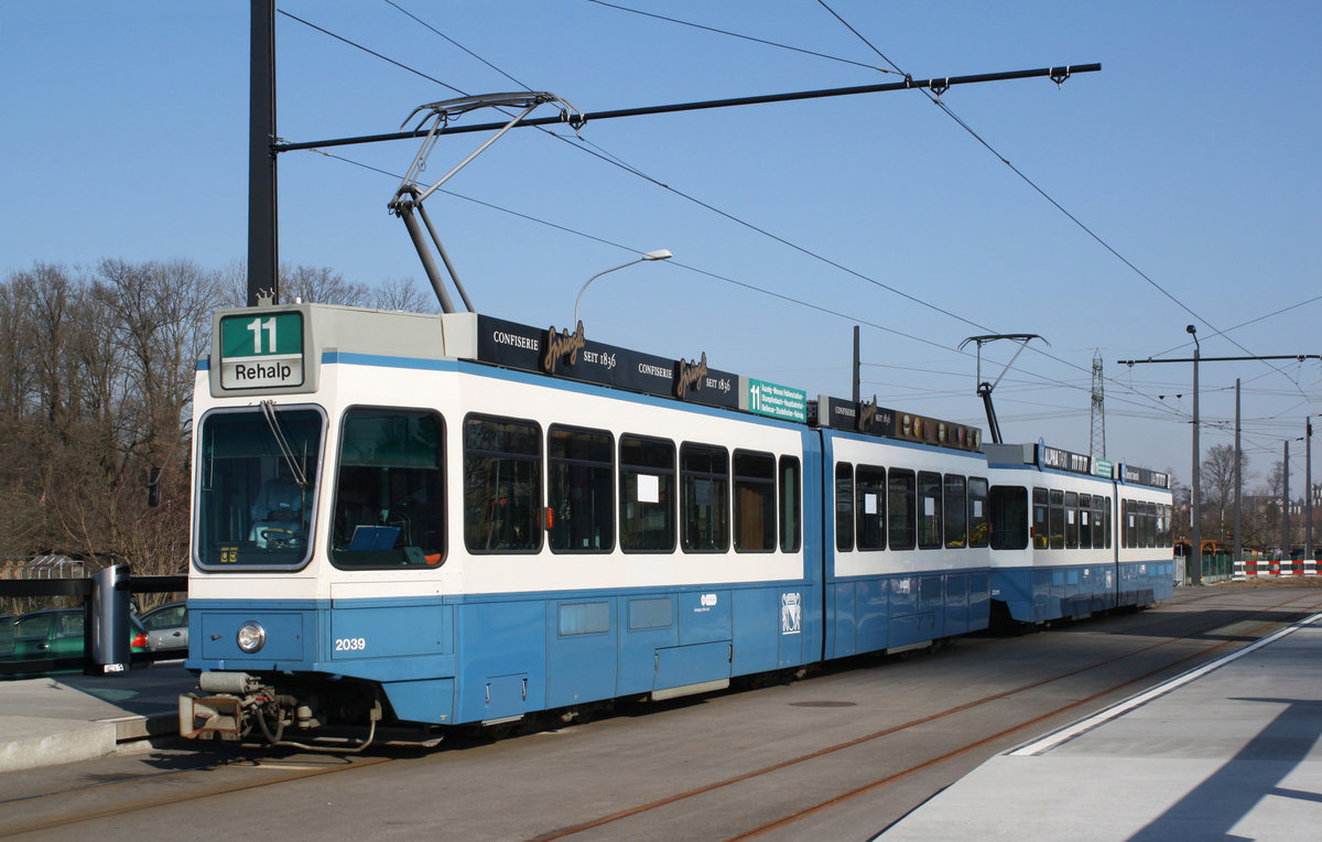 Linie 11 Wagennummer 2010 „Wipkingen“ kurz nach der Haltestelle Auzelg. Datum: 10. 2. 2021