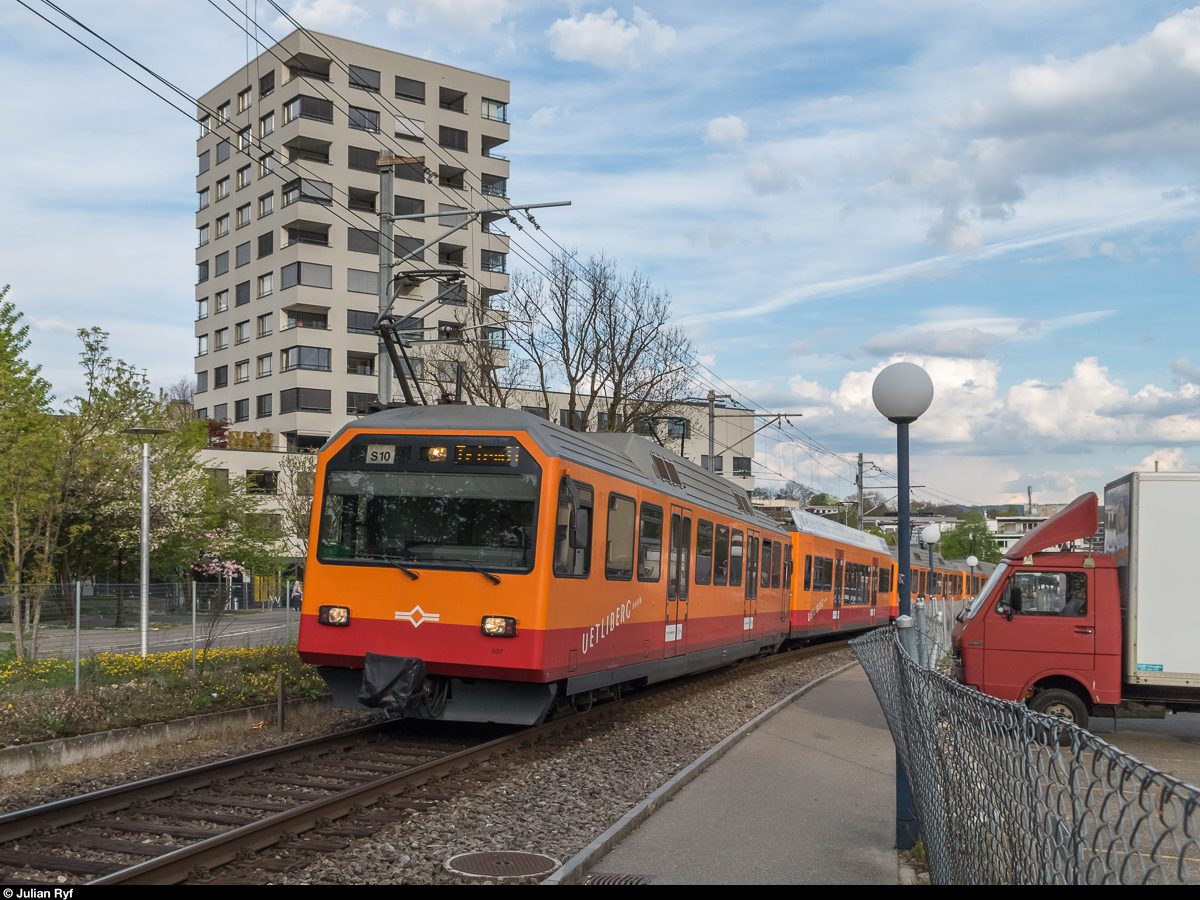 Der SZU Be 516 durchfährt mit in Doppeltraktion mit einem Artgenossen am 11. April 2015 Zürich Giesshübel auf seinem Weg auf den Uetliberg. Hier gut zu sehen der seitlich angeordnete Stromabnehmer. Dies ist nötig, weil sich die mit 1200V Gleichstrom elektrifizierte Uetlibergbahn das Gleis zwischen Zürich HB und Zürich Giesshübel teilweise mit der mit 15kV Wechselstrom elektrifizierten Sihltalbahn teilt. Die neuen Stadler-Züge besitzen verschiebbare Pantographen und eine Zweistromausrüstung, damit ein Einsatz auf beiden Strecken möglich ist. Derzeit kommen sie aber wie hier fast ausschliesslich auf der Uetlibergbahn zum Einsatz. Julian Ryf