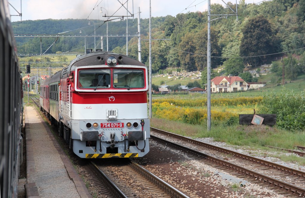 754 071-9 ∙ Kreuzung der Regionalzüge im Bahnhof Vlkanová um 14:40: links Os 7356 nach Banská Bystrica/Neusohl - Brezno/Bries; rechts die 754 071-9 mit Os 7325 in gleicher Gegenrichtung nach Zvolen os. st./Altsohl Persbf.; 02.09.2011 Tomas Kowalski