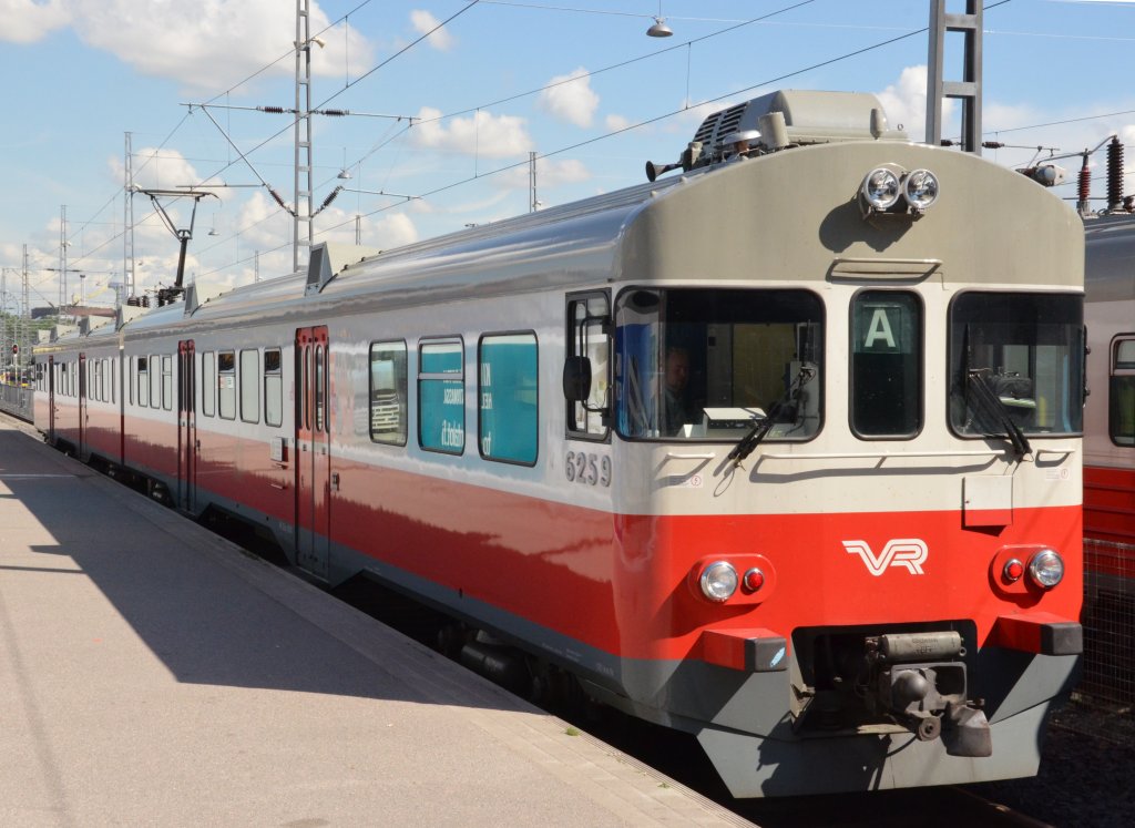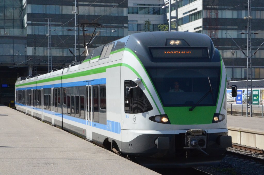 Der moderne Triebwagen Sm5 für die S-Bahn Helsinki der Firma Pääkaupunkiseudun Junakalusto verlässt am 07.06.2012 gerade den Bahnhof Helsinki. M. Schiebel