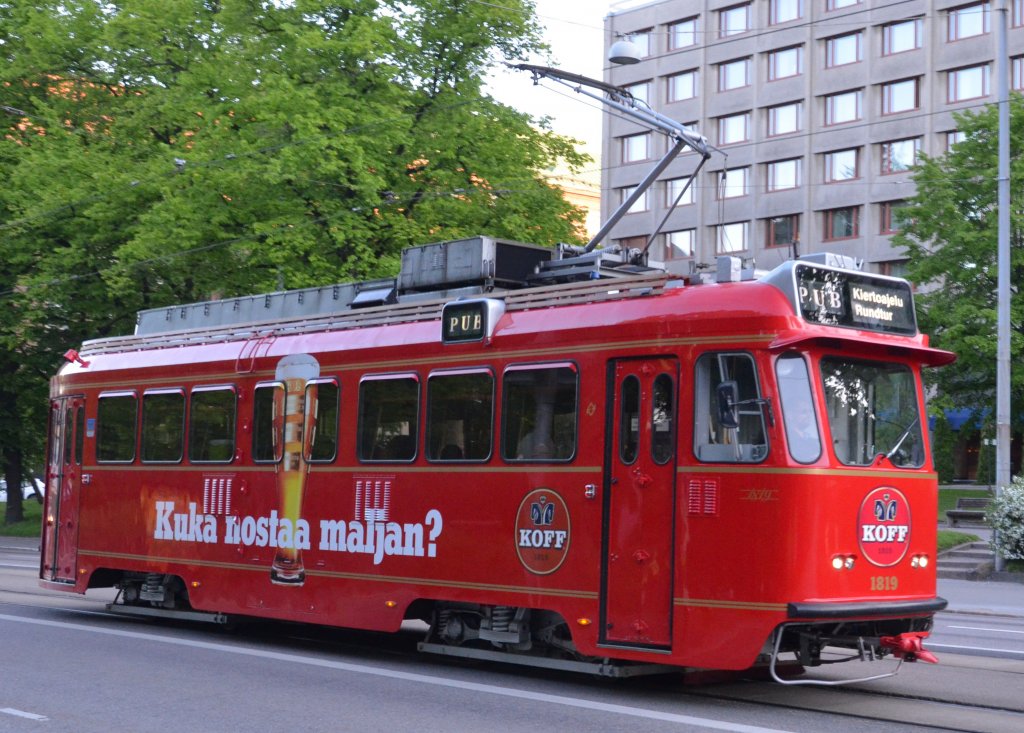 Fahrzeug 99 der HKL/HST vom Typ Valmet MLNRV 2 mit Werbung für "Nick`s" Eis am 14.5.2022 an der Haltestelle Eteläranta (deutsch: Südhafen) auf der Linie 2 (Olympiaterminaali – Länsi-Pasila). Markus Klausnitzer