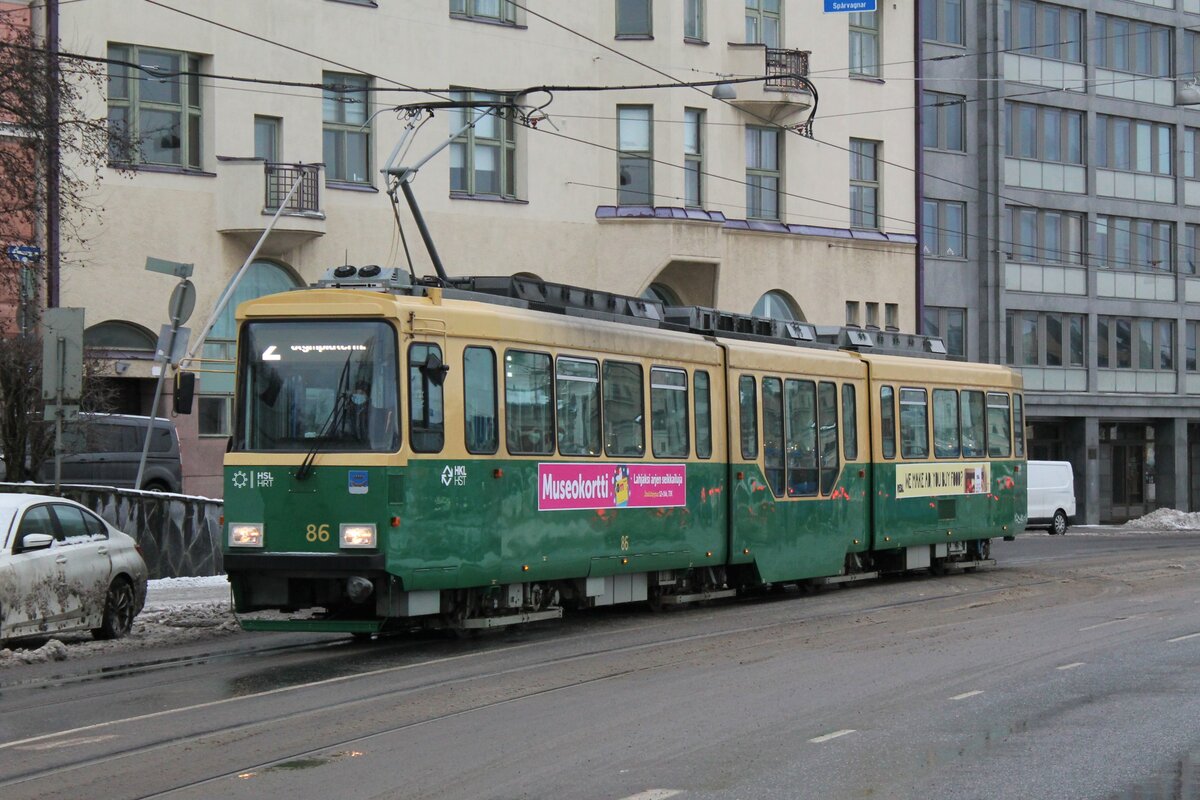 Fahrzeug 86 der HKL/HST vom Typ Valmet MLNRV 2 am 31.12.2021 unterwegs auf der Linie 2 (Olympiaterminaali – Länsi-Pasila). Hier zu sehen in der Laivasillankatu auf dem Weg zur Haltestelle Olympiaterminaali. Markus Klausnitzer