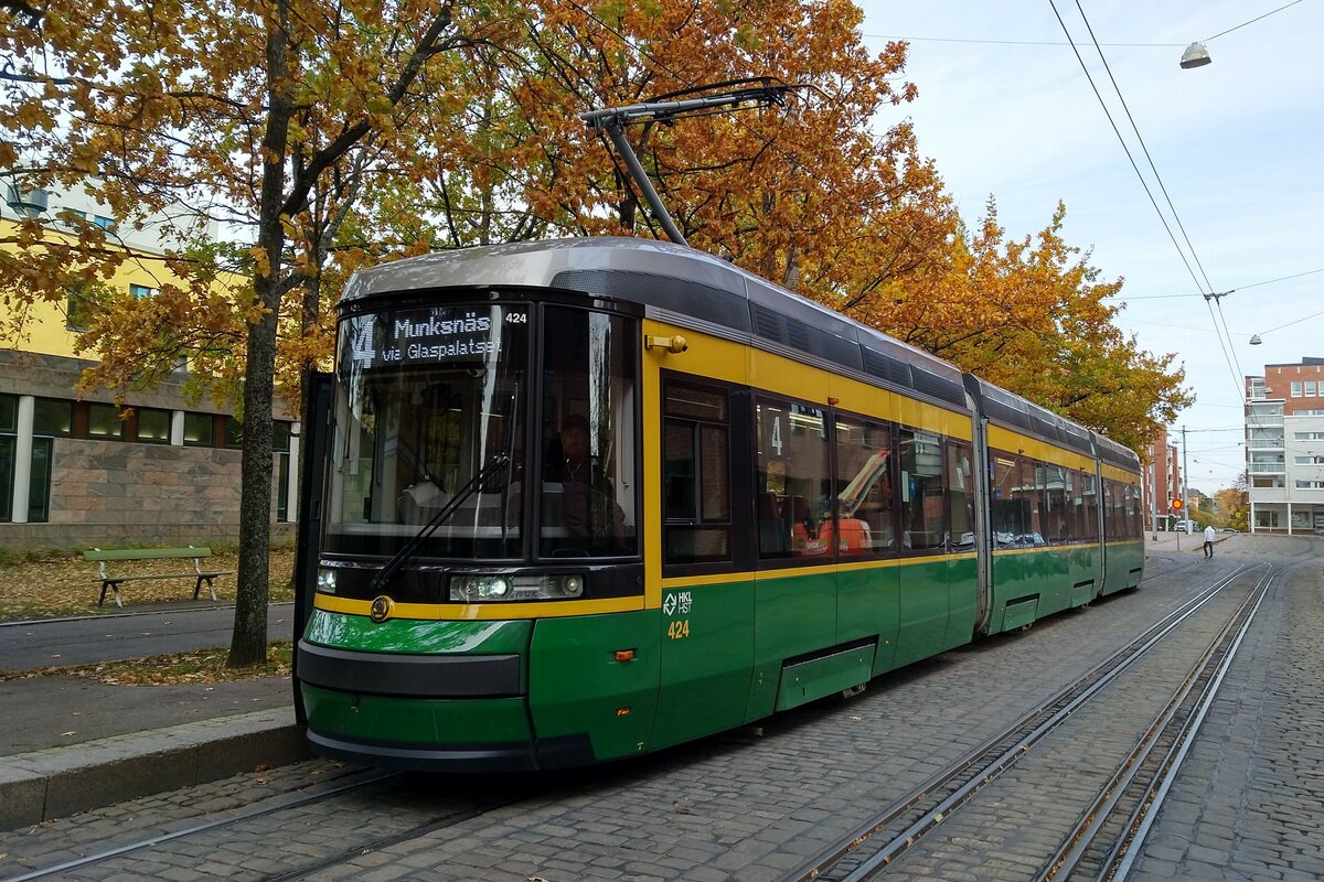 Fahrzeug 424 der HKL/HST vom Typ Skoda-Arctic (Transtech) MLNRV III Tram TW 52 auf der Linie 4 (Munkkiniemi/Munksnäs-Katajanokka/Skatudden). Hier am 4.10.2021 an der Haltestelle Merisotilaantori (Flottisttorget) im Stadtteil Katajanokka.