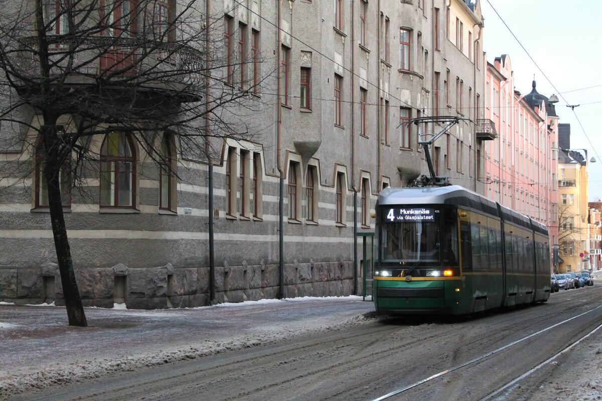 Fahrzeug 425 der HKL/HST vom Typ Skoda-Arctic (Transtech) MLNRV III Tram TW 52 auf der Linie 4 (Munkkiniemi/Munksnäs-Katajanokka/Skatudden). Hier am 31.12.2021 an der Haltestelle Kauppiaankatu (Köpmansgatan) im Stadtteil Katajanokka. Markus Klausnitzer