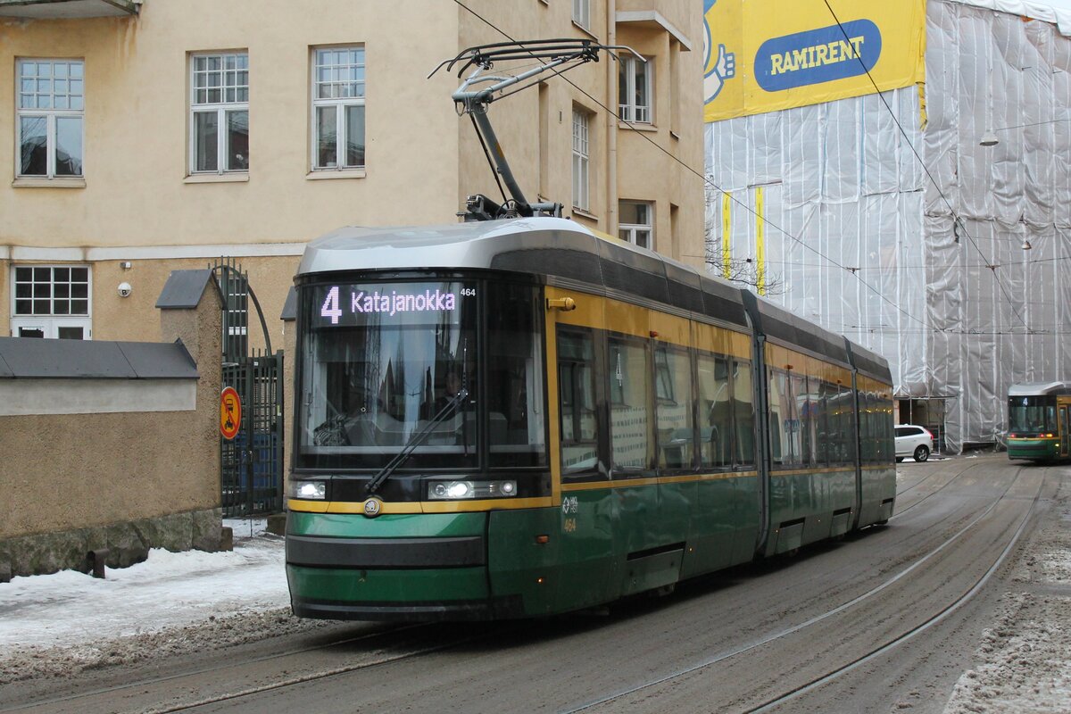 Fahrzeug 464 der HKL/HST vom Typ Skoda-Arctic (Transtech) MLNRV III Tram TW 52 auf der Linie 4 (Munkkiniemi/Munksnäs-Katajanokka/Skatudden). Hier am 31.12.2021 in der Linnankatu kurz vor dem Erreichen der Haltestelle Vyökatu im Stadtteil Katajanokka Markus Klausnitzer